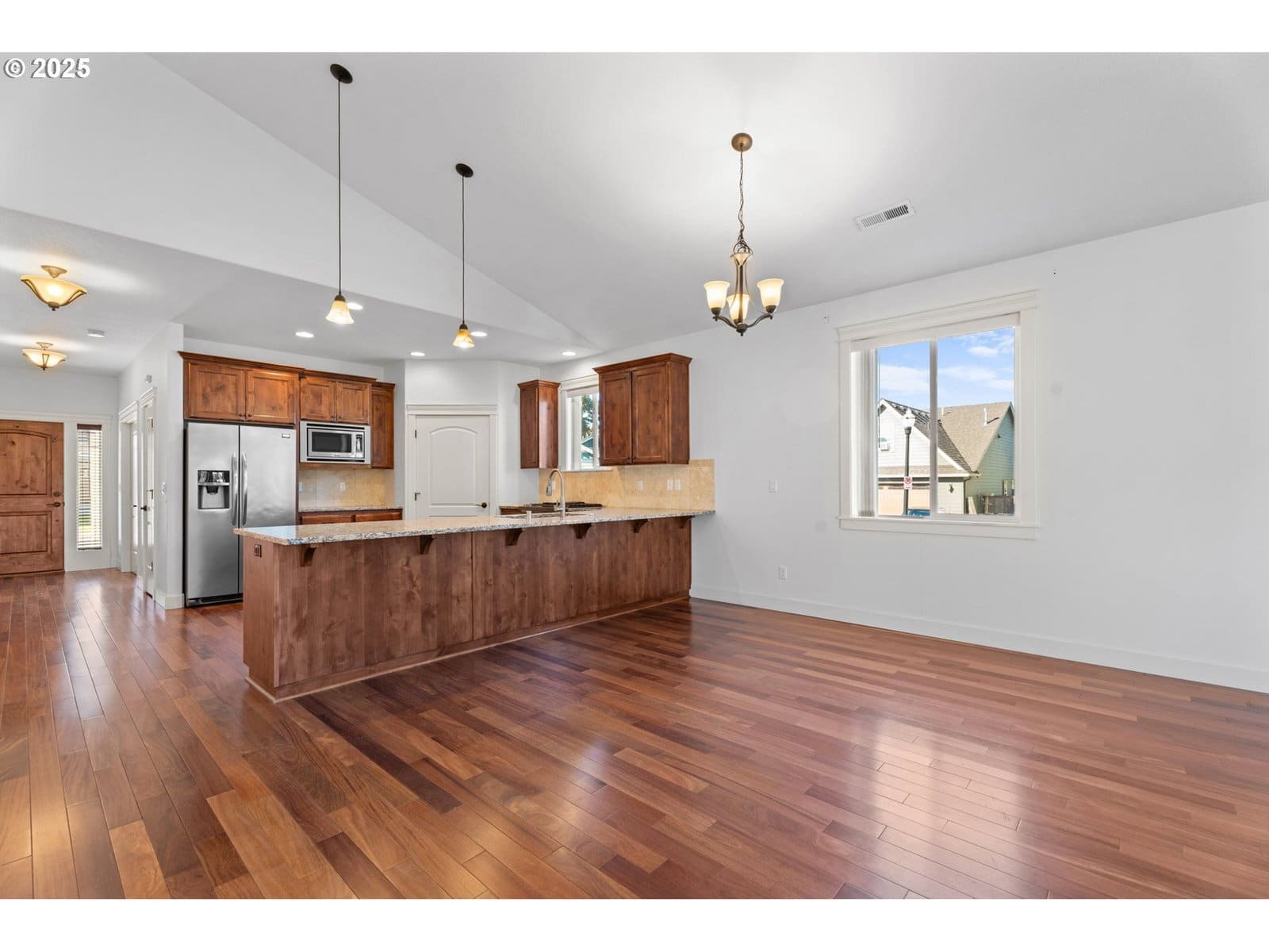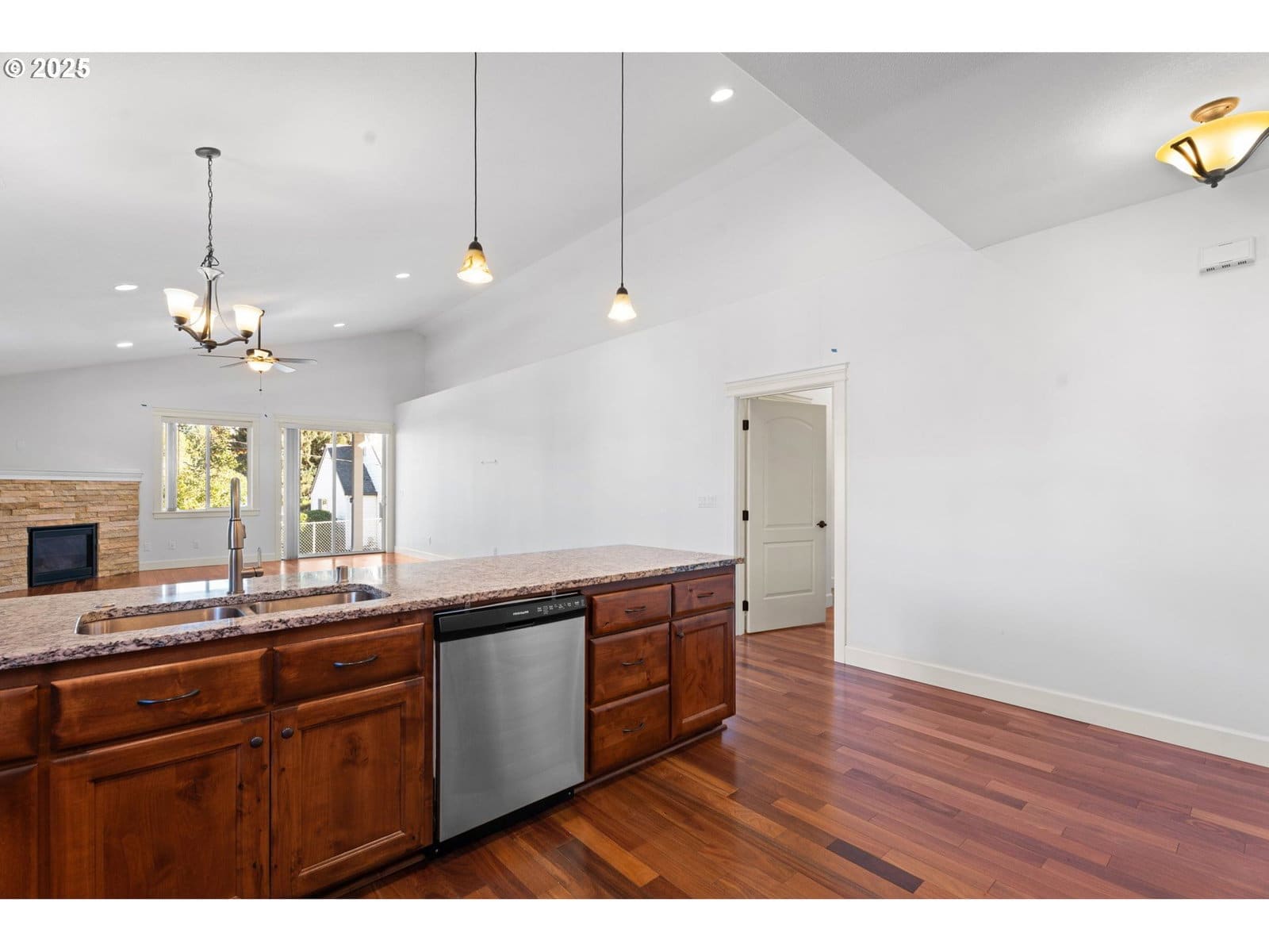 Welcome to this beautifully maintained one-level home on a desirable corner lot! Built in 2016, this 3-bedroom, 2-bathroom home offers 1,778 sq. ft. of comfortable living space. Enjoy REAL hardwood flooring throughout, a spacious family room with vaulted ceilings, and a cozy gas fireplace. The open-concept kitchen features stainless steel appliances and plenty of counter space, perfect for cooking and entertaining. The primary suite includes a luxurious ensuite bath with heated tile floors for year-round comfort. Step outside to a fully fenced, low-maintenance backyard with a large covered patio, ideal for entertaining. Conveniently located just minutes from shopping and dining. Only a 15-minute drive to PDX International Airport. No HOA. Rentals are allowed!