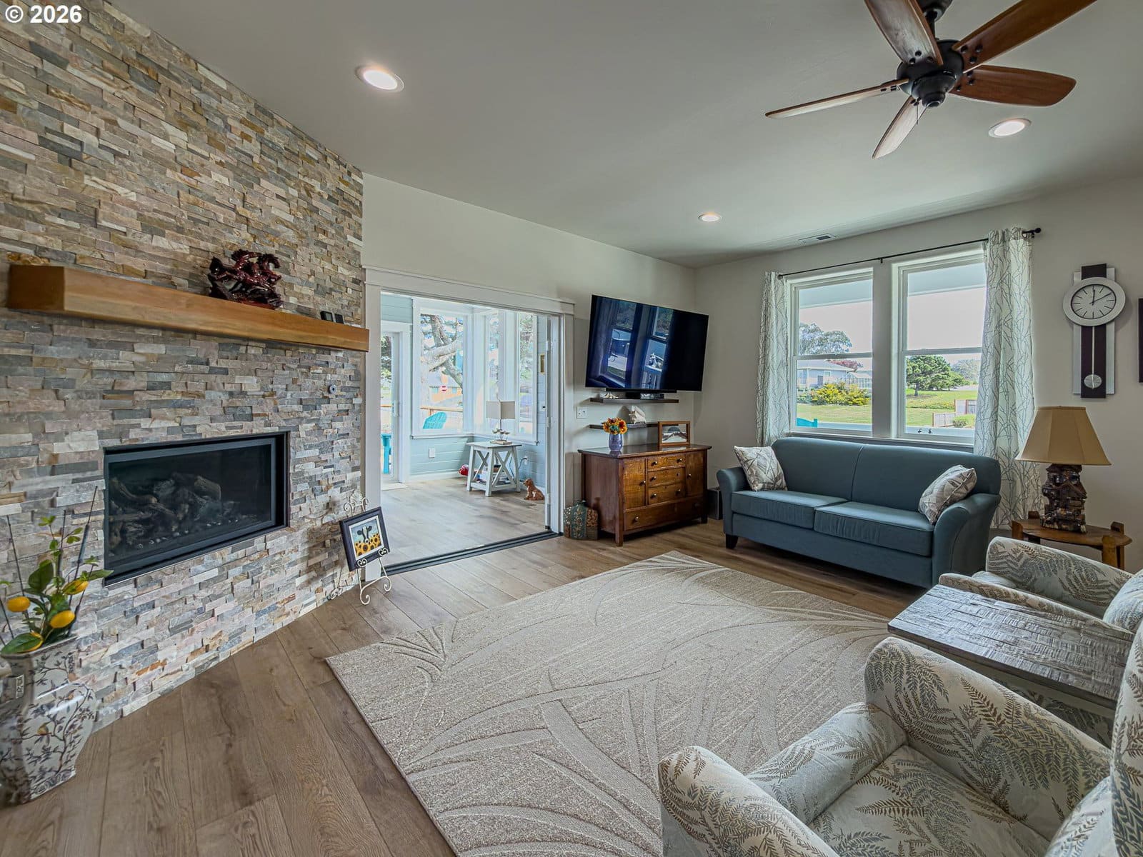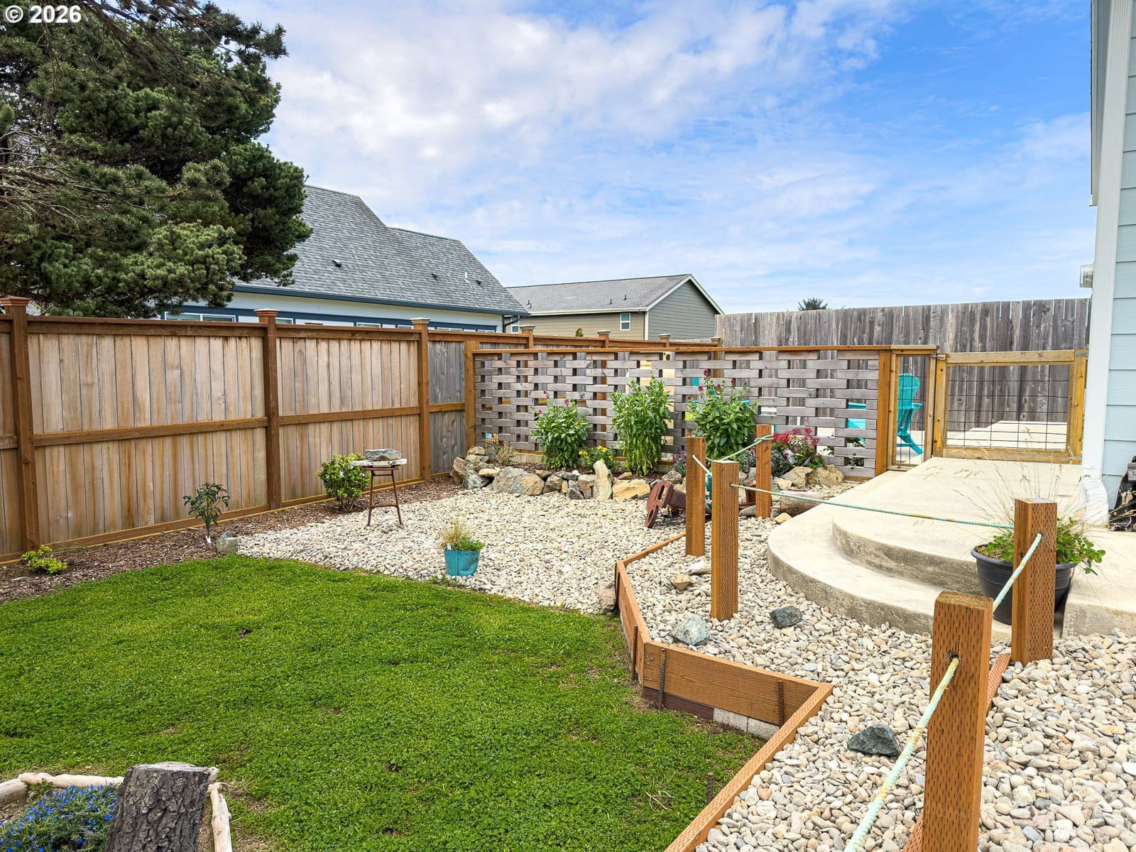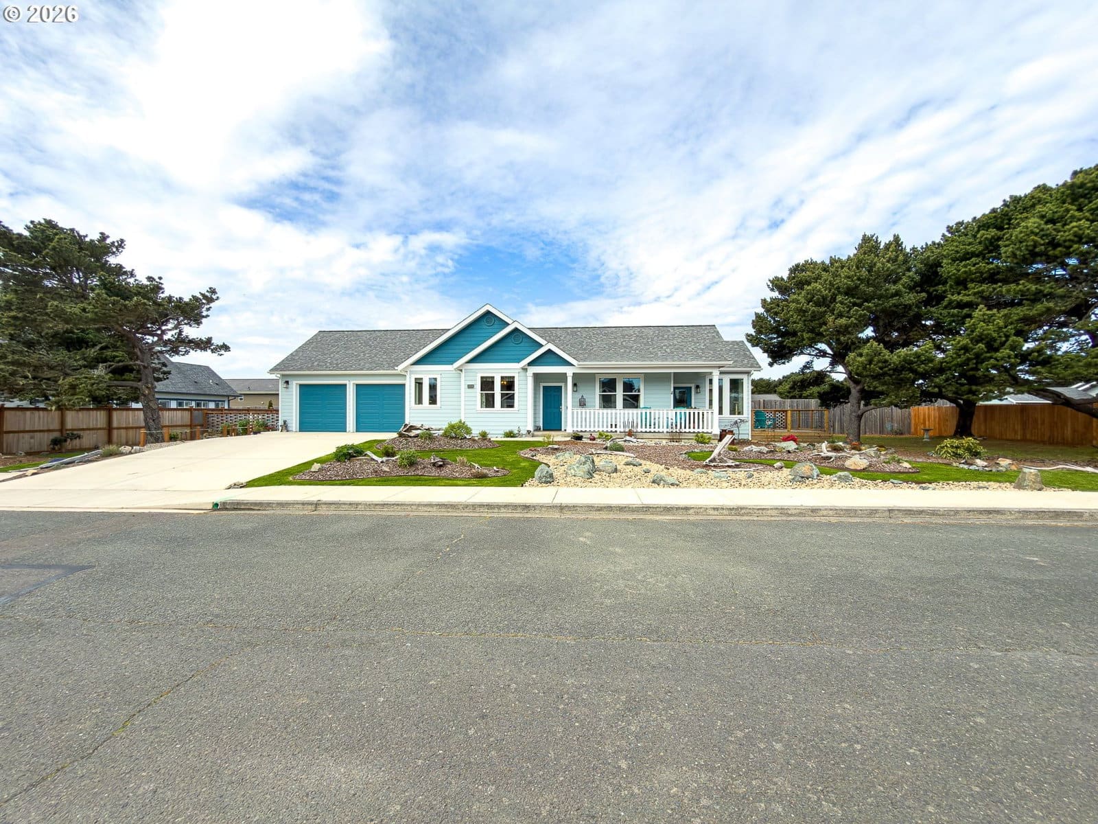 Experience coastal living at its finest at 3214 Lincoln Ave SW in Bandon, Oregon, where this impeccably maintained, custom-built single-level home offers effortless comfort just moments from public beach access in a sought-after neighborhood of newer homes and welcoming neighbors. Designed for easy living, the residence pairs low-maintenance appeal with exceptional craftsmanship throughout, from the inviting front porch to a light-filled living room featuring a stone-stacked fireplace that flows seamlessly into a beautiful custom sunroom and out to a composite deck, ideal for year-round enjoyment. The primary suite features a thoughtfully appointed ensuite with a granite countertop, built-in linen cabinetry, and a stunning tiled walk-in shower, while the second bedroom is conveniently located near a well-appointed guest bath with granite finishes and another elegant tiled walk-in shower. The sparkling kitchen impresses with slab granite counters, a gas cooktop, a generous walk-in pantry, and included appliances. A double car garage, efficient heat pump heating, LVP flooring throughout and a spacious laundry room complete with washer & dryer add to the interior amenities. Additional highlights include a sunny south-facing concrete patio, lush landscaping with a charming clover lawn and convenient concrete walkways surrounding the home, This flawless home offers a refined blend of style, function, and coastal proximity, creating a place you will truly love coming home to. Make sure to watch the Video Tour!