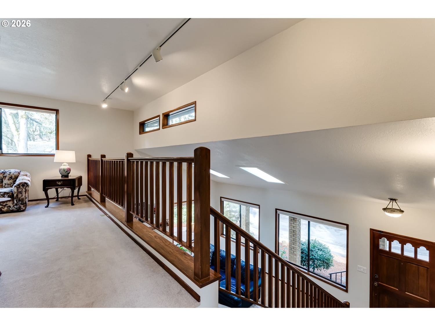 Charming home with beautiful wood accents, tucked away in a peaceful neighborhood! Enjoy the natural setting and seasonal views from every window! The main level features a vaulted living room with skylights, fireplace and dining area. The kitchen has an eating bar, pantry and stainless steel appliances. Spacious main level primary bedroom has a double closet. The second bedroom is vaulted with two closets and a skylight. Upstairs has a generous loft and bedroom with attached full bathroom. Brand new HVAC system in 2026! Low maintenance yard has a large deck, garden beds, small covered patio area and is partially fenced for extra privacy, plus a small year around creek to enjoy! The two car garage has built in storage and a utility sink.